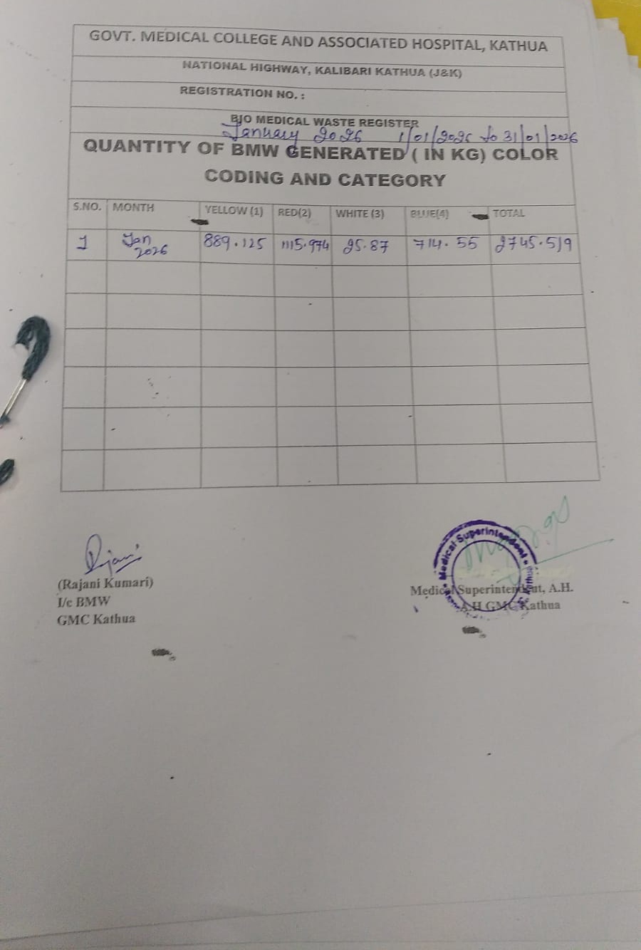 • Monthly Report of BMW on Dated 01-01-2024 to 31-01-2024.