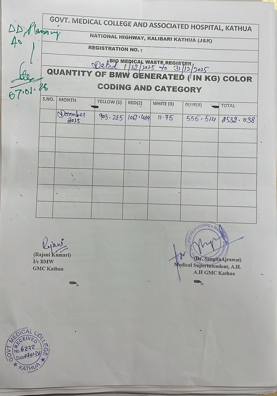• Monthly Report of BMW on Dated 01-01-2024 to 31-01-2024.
